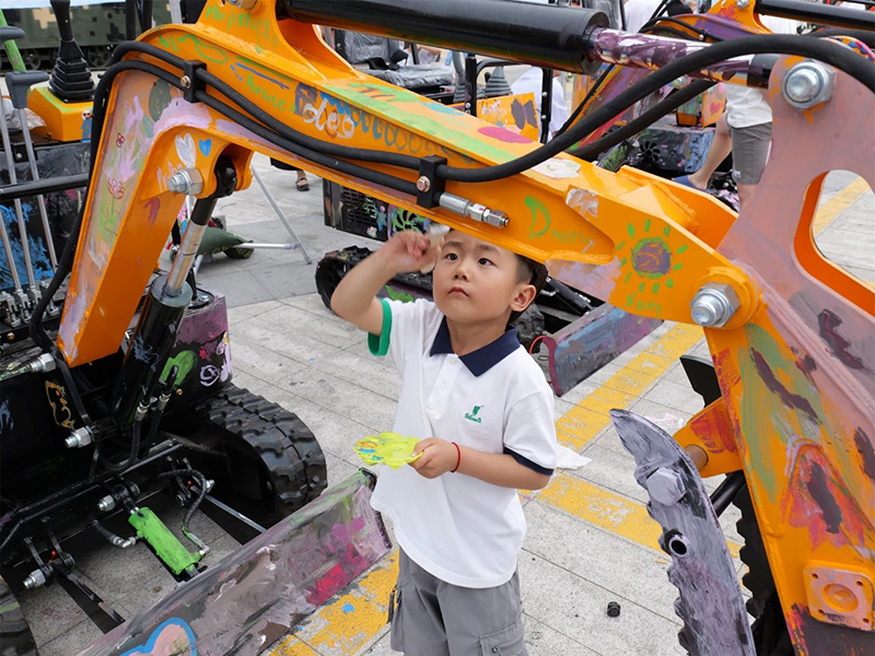 2、創(chuàng)意涂鴉賦能工業(yè),引爆話題:小藝術(shù)家們揮灑水彩,將充滿(mǎn)想象力的涂鴉藝術(shù)與海拓機(jī)械的硬朗工業(yè)風(fēng)完美融合,色彩斑斕的圖案跳躍在鋼鐵巨獸之上,瞬間柔化了工業(yè)產(chǎn)品的棱角,繪就了一道獨(dú)特亮麗、極具反差美的風(fēng)景線,創(chuàng)造出專(zhuān)屬于六一兒童節(jié)的“限量款”藝術(shù)挖機(jī)。