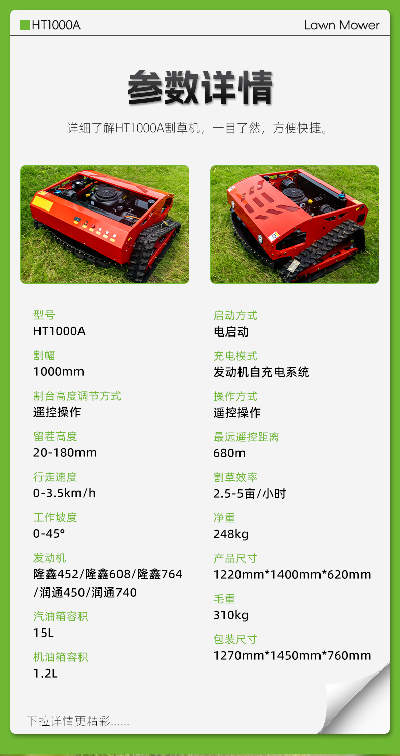 HT1000A遙控割草機(jī)滿油續(xù)航可達(dá)8-10小時(shí)