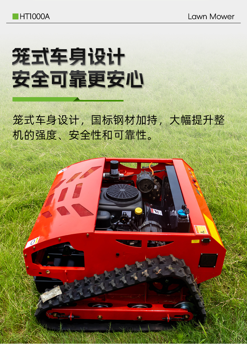 HT1000A遙控割草機(jī)籠式車(chē)身設(shè)計(jì),國(guó)標(biāo)鋼材加持,大幅提升整機(jī)的強(qiáng)度、安全性和可靠性。