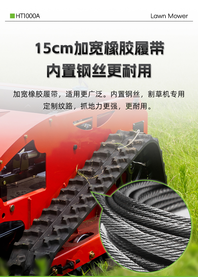 加寬橡膠履帶,適用更廣泛。內(nèi)置鋼絲,割草機(jī)專(zhuān)用定制紋路,抓地力更強(qiáng),更耐用。