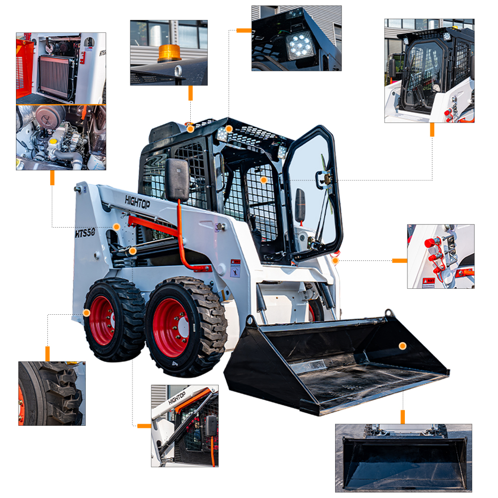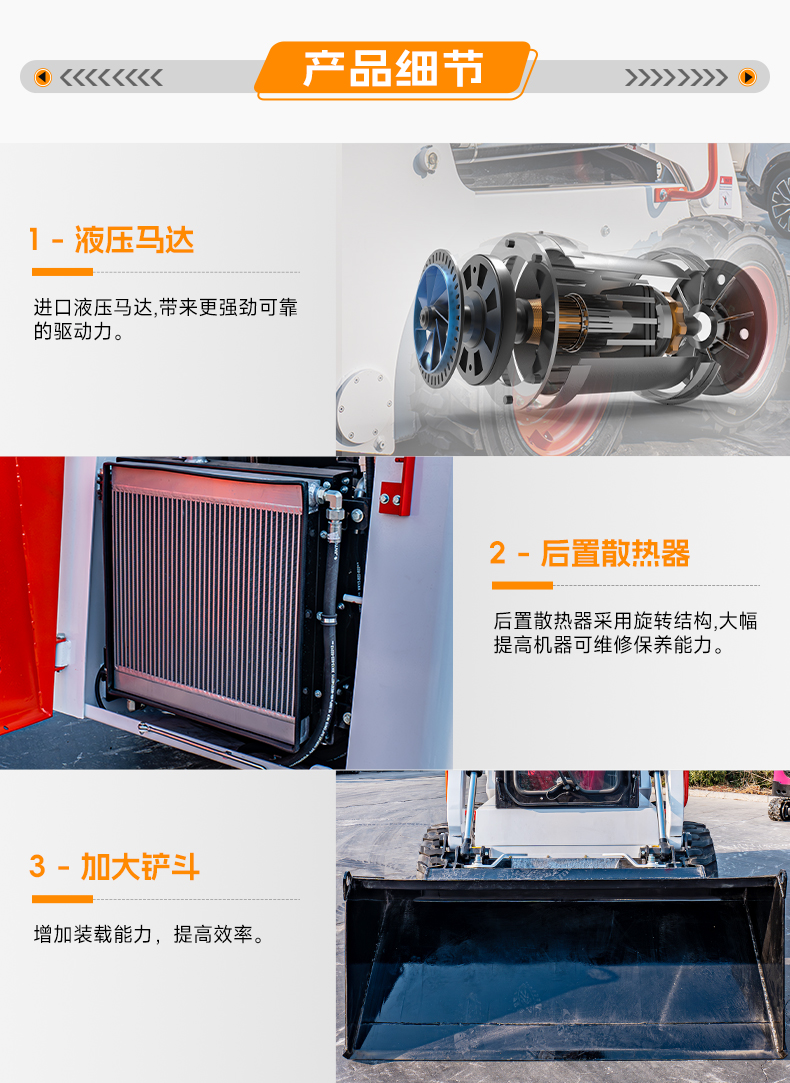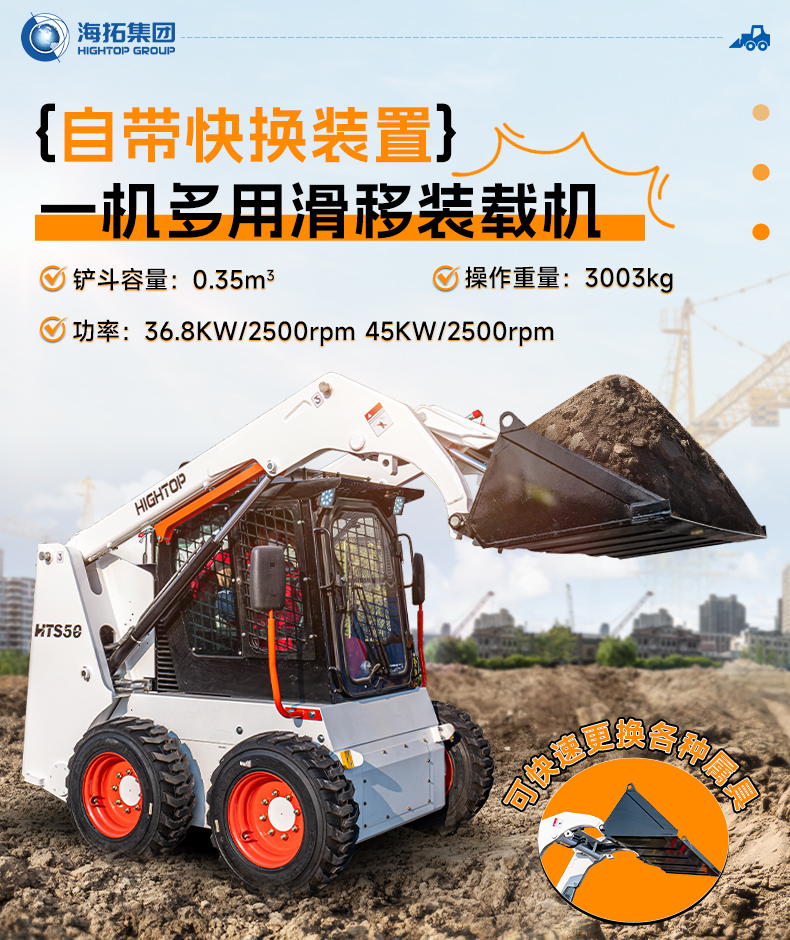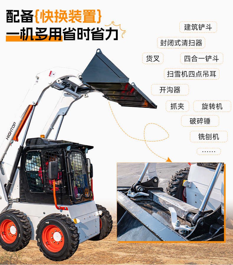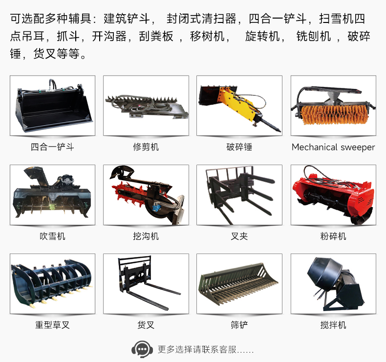 5,可選配多種輔具:建筑鏟斗, 封閉式清掃器,四合一鏟斗,掃雪機四點吊耳,抓斗,開溝器
