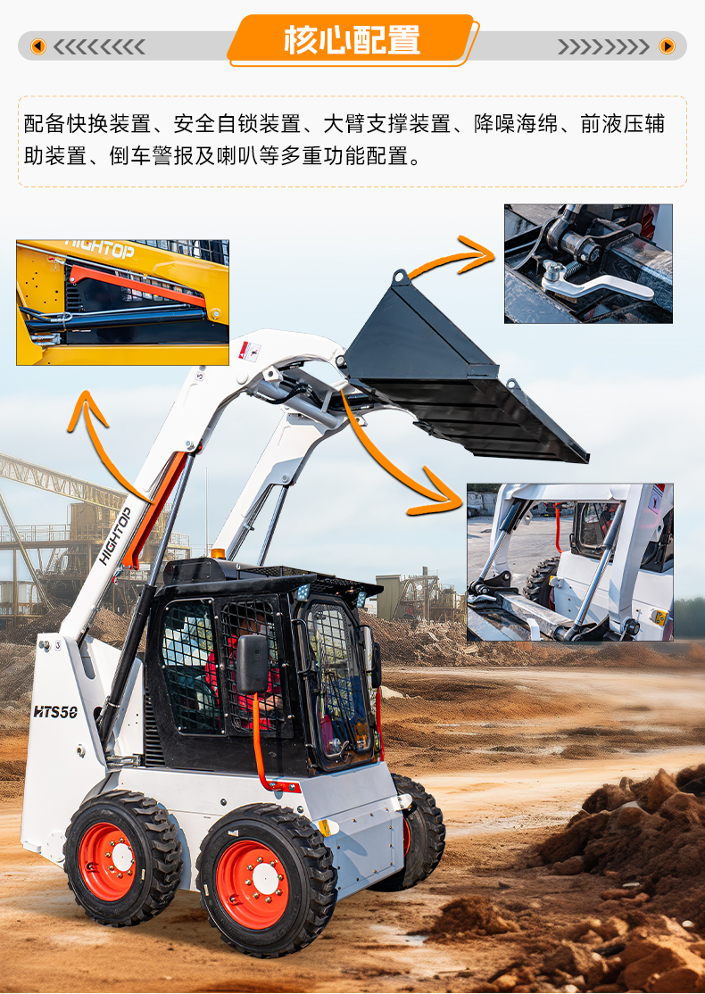 2,配備快換裝置、安全自鎖裝置、大臂支撐裝置、降噪海綿、前液壓輔助裝置、倒車警報及喇叭等多重功能配置。